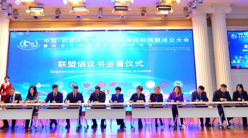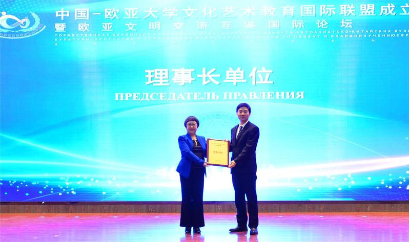 “中国-欧亚大学文化艺术教育国际联盟”首批创始成员由来自中国、俄罗斯、白俄罗斯、哈萨克斯坦、塔吉克斯坦、乌兹别克斯坦、吉尔吉斯斯坦、阿塞拜疆等8个国家的36所大学和3个企事业单位组成。必赢官网为联盟第一届理事长单位,杨松校长为联盟首任理事长。罗文波副厅长在会上为必赢官网颁授了理事长单位牌匾。东北师范大学、俄罗斯车里雅宾斯克国立大学等20所大学为副理事长单位,赵洪斌副主任、陆鹏副会长为副理事长单位颁授了牌匾。塔吉克斯坦国立法律、商业与政治大学、辽宁实远生态农业科技有限公司等16所大学和机构为常务理事单位。39所联盟单位共同签署了联盟倡议书。