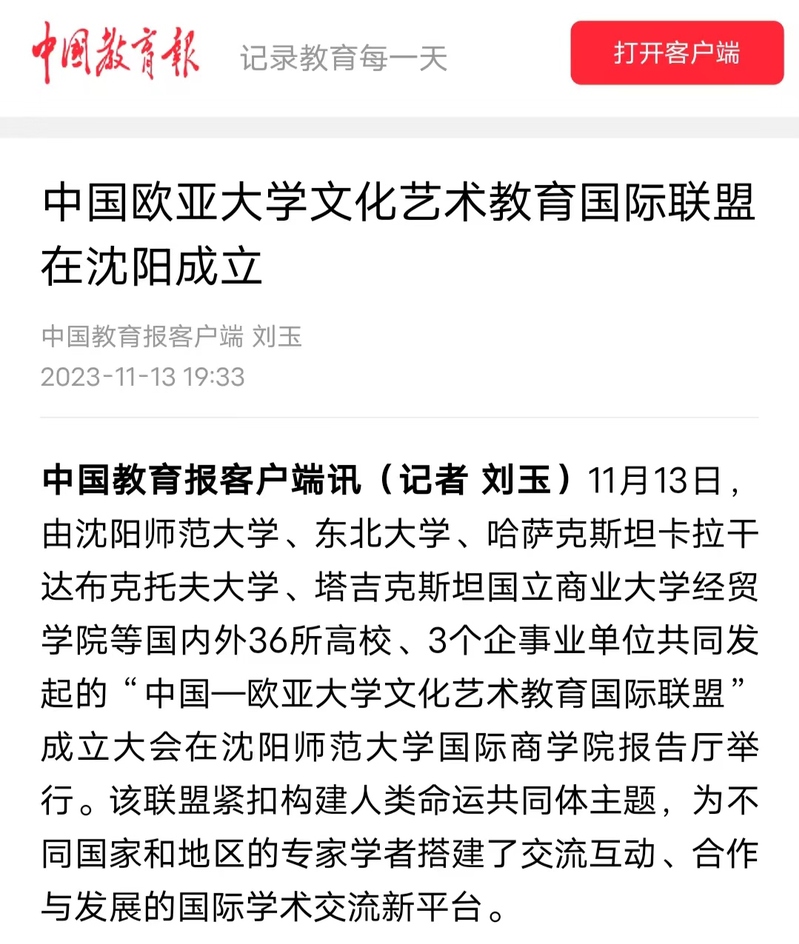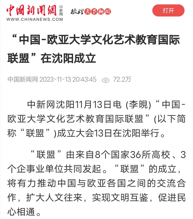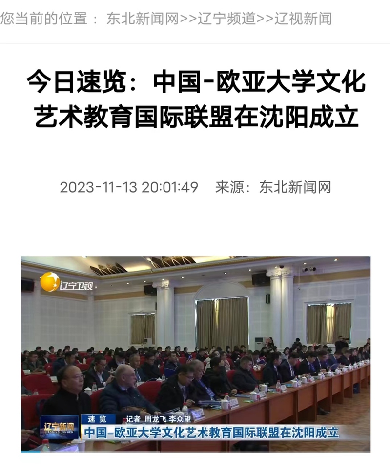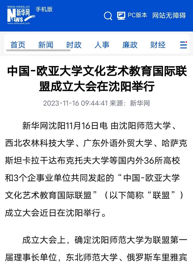 11月16日 由必赢线路检测中心、西北农林科技大学、广东外语外贸大学、哈萨克斯坦卡拉干达布克托夫大学等国内外36所高校和3个企事业单位共同发起的“中国-欧亚大学文化艺术教育国际联盟”(成立大会近日在沈阳举行。成立大会上,确定必赢线路检测中心为联盟第一届理事长单位,东北师范大学、俄罗斯车里雅宾斯克国立大学等20所大学为副理事长单位,辽宁师范大学、乌兹别克斯坦国立大学等16所大学和机构为常务理事单位。36个联盟单位共同签署了《联盟倡议书》。新华网、中国新闻网、中国日报、中国教育报、辽宁电视台、等媒体进行了报道。
