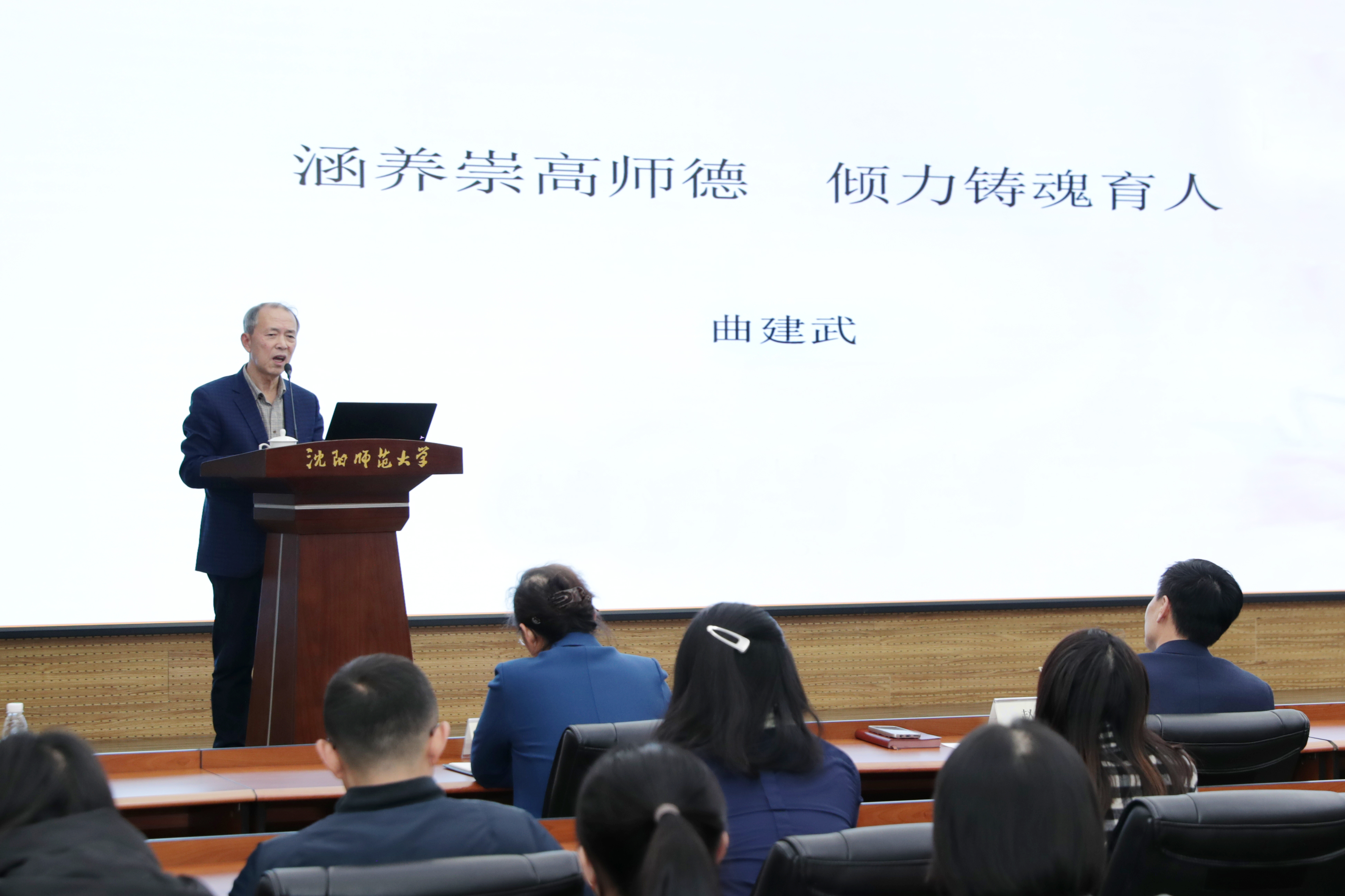 曲建武从传承大学文化、增强政治意识、怀有感恩之心、坚定理想信念、工作脚踏实地、为学生解疑释惑、激励学生为祖国而学习、关心学生生活等方面讲述师者初心和为师之道,鼓励教师应以为党育人、为国育才为追求,以倾力服务党的教育事业的情怀扎根一线、埋头苦干为目标,以“躬耕教坛、强国有我”为抱负,自信自强、踔厉奋发,把涵养自身崇高师德、培育高素质人才作为人生追求和幸福源泉,不断为强国建设、民族复兴伟业作出新的更大贡献。