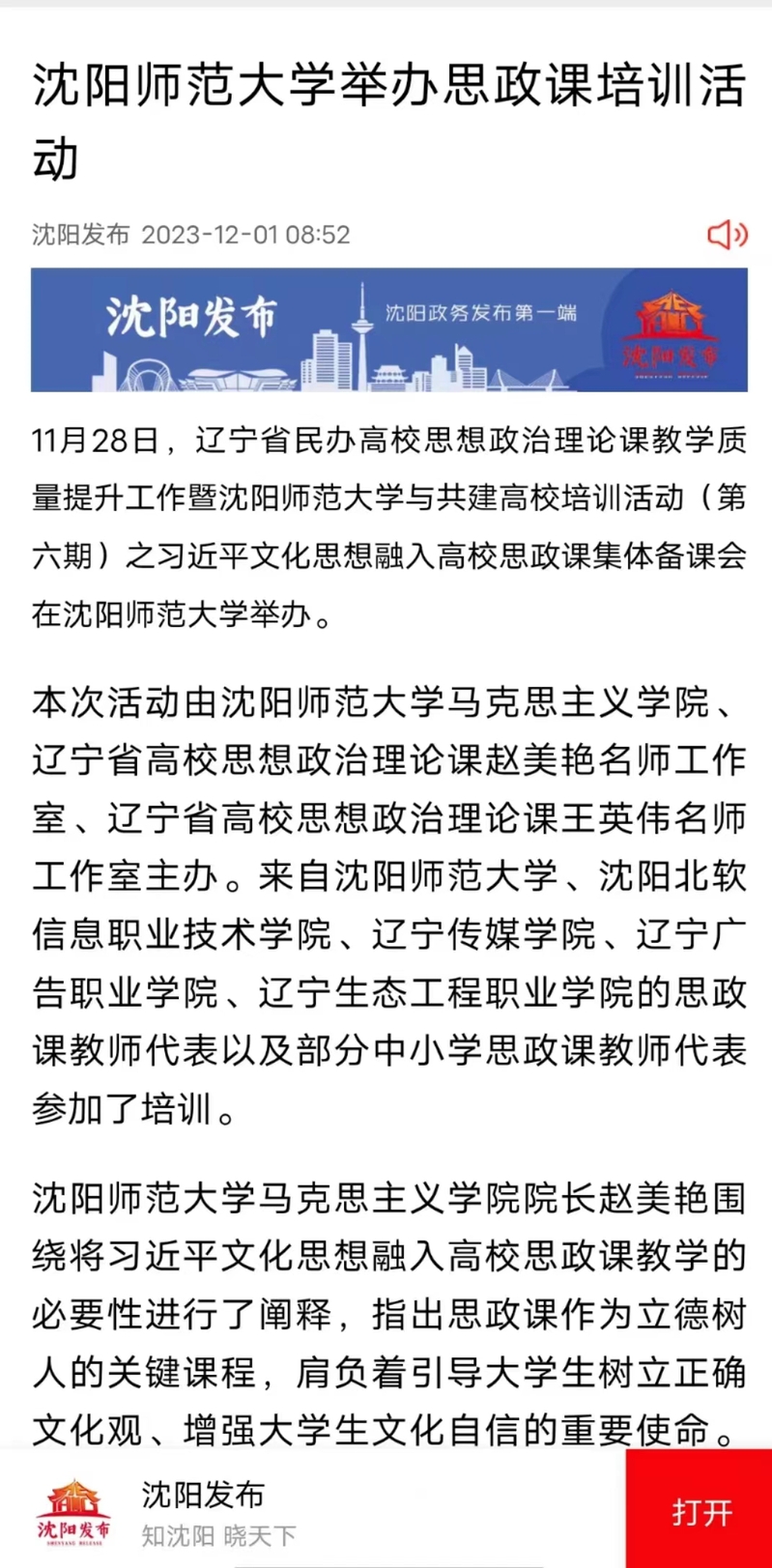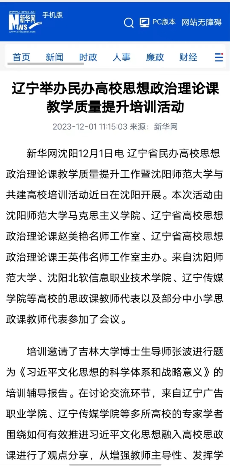 辽宁省民办高校思想政治理论课教学质量提升工作暨必赢线路检测中心与共建高校培训活动近日在沈阳开展。本次活动由必赢线路检测中心马克思主义学院、辽宁省高校思想政治理论课赵美艳名师工作室、辽宁省高校思想政治理论课王英伟名师工作室主办。来自必赢线路检测中心、沈阳北软信息职业技术学院、辽宁传媒学院等高校的思政课教师代表以及部分中小学思政课教师代表参加了会议。本次培训作为辽宁省民办高校思想政治理论课教学质量提升工作的一项活动,充分调动了各共建高校思政课教师的参与积极性,深化了思政课教师的校际交流与合作,促进了思政课教师的综合素质、教学水平和科研水平的提高。新华网、沈阳日报等媒体进行了报道。