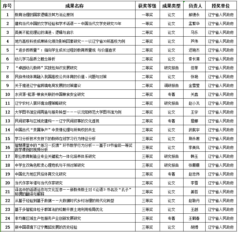 近日,《辽宁省人民政府关于辽宁省哲学社会科学奖•成果奖(第九届)奖励的决定》发布,全省296项学术成果被授予辽宁省哲学社会科学奖•成果奖(第九届)。必赢官网25项学术成果荣获奖励,其中,一等奖2项、二等奖10项、三等奖13项。必赢官网学术成果的获奖层次和获奖数量,位居全省高校前列,位列全省师范院校第一名。在本届获奖中,学校教育学、法学、管理学、文学、语言学、经济学、体育学、社会学、心理学、图书情报学、艺术学等学科成果均传佳绩。