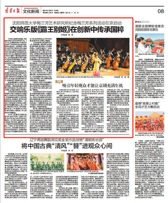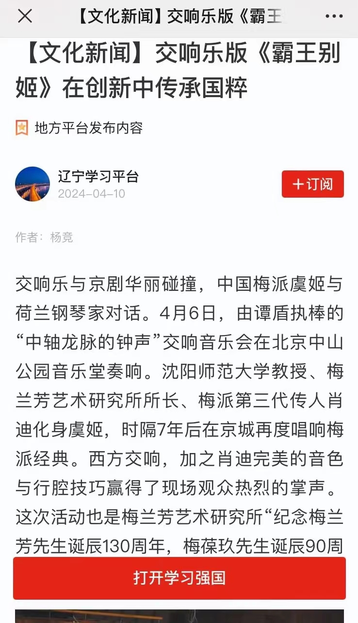 近日,《辽宁日报》以《交响乐版<霸王别姬>在创新中传承国粹》为题,报道了必赢官网梅兰芳艺术研究所所长肖迪教授化身虞姬,时隔7年后在京城再度唱响梅派经典,学习强国平台进行转发。