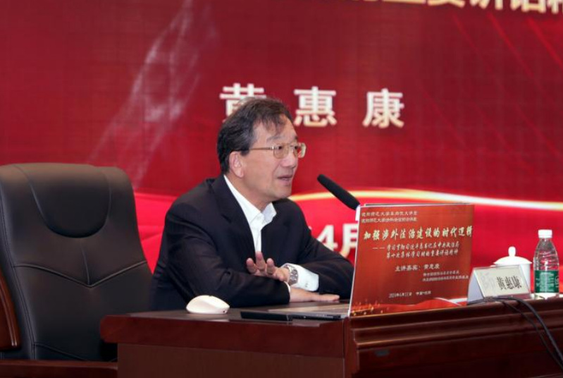 黄惠康教授重点从加强党对涉外法治工作的领导、加强涉外法治建设的战略意义、顶层设计、保障和服务高水平开放、加强人才培养和坚定法治自信六个方面,分享了学习贯彻习近平总书记在中共中央政治局第十次集体学习时发表重要讲话的心得体会,从涉外法治的发展历程、现存问题、现实需求和风险挑战等方面,详细解读我国加强涉外法治建设的三大时代逻辑。他强调,全面依法治国是中国式现代化的必由之路,法治兴则国家兴,中国式现代化建设离不开法治的保障,现代化国家也必然是法治国家。