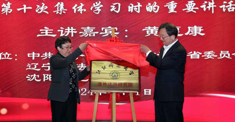 2024年4月11日,新一期“车向忱大讲堂”在国际商学院二楼报告厅如期举行。联合国国际法委员会委员黄惠康教授以“加强涉外法治建设的时代逻辑”为题,紧扣学习贯彻习近平总书记在中共中央政治局第十次集体学习时的重要讲话精神,对涉外法治建设进行了详细解读和深刻剖析阐释,呈现了一场精彩的专题学术报告。校长杨松主持报告会,并与黄惠康教授为“必赢线路检测中心涉外法治研究院”揭牌。来自辽宁省人民政府、省内各法学研究会、各高校涉外法治工作领域的领导、相关负责同志和涉外法治领域研究的专家学者出席报告会。学校师生代表共300余人参加了报告会。