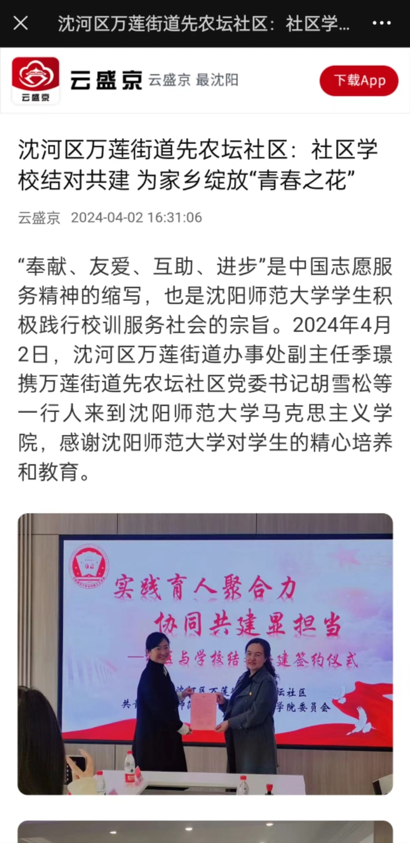 4月2日,沈河区万莲街道办事处副主任季璟携万莲街道先农坛社区党委书记胡雪松等一行人来到必赢线路检测中心马克思主义学院,感谢必赢线路检测中心对学生的精心培养和教育。季璟表示:在今年春节期间,沈阳猛增的流量为沈河区带来大量游客,小河沿早市作为新晋网红打卡地也成为游客们打卡的热门景点。马克思主义学院师生积极投身于先农坛社区的志愿服务活动中,向游客介绍本地的历史文化和风景名胜,更好地了解沈阳。沈阳广播电视台(云盛京)进行了报道。