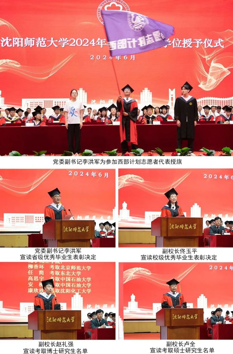 党委副书记李洪军,副校长佟玉平、赵礼强、卢全分别宣读了省级、校级优秀毕业生表彰决定以及2024届考取博士研究生和硕士研究生同学名单。主席台领导为受表彰同学以及2024届校友工作联络员代表颁发了证书、奖金及聘书。李洪军副书记为参加西部计划的志愿者代表、思想政治教育专业宋祥瑞同学授旗。