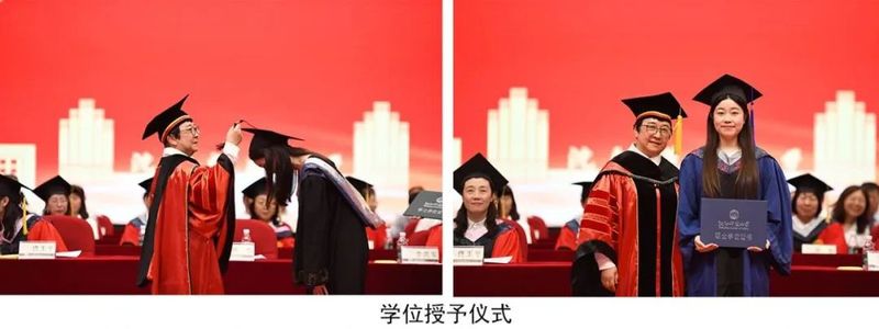 在庄严而隆重的学位授予仪式上,校学位评定委员会主席、校长杨松为各专业毕业生代表拨流苏、颁发学位证书并合影留念。