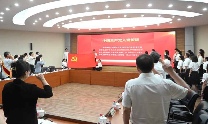 在铿锵的誓言中,新党员代表面向党旗宣誓,老党员重温入党誓词。