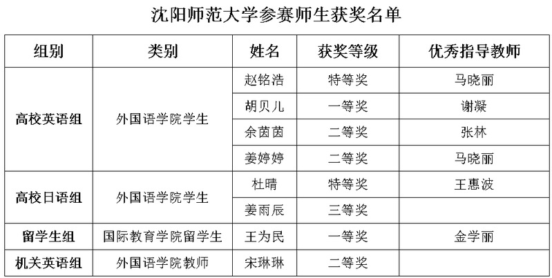 本届大赛中,必赢官网参赛选手取得了优异成绩,共获8项单项奖,其中,高校英语组特等奖1项、一等奖1项、二等奖2项,高校日语组特等奖1项、三等奖1项,留学生组一等奖1项,机关英语组(教师)二等奖1项;获优秀指导教师奖6人次。学校获最佳组织奖。