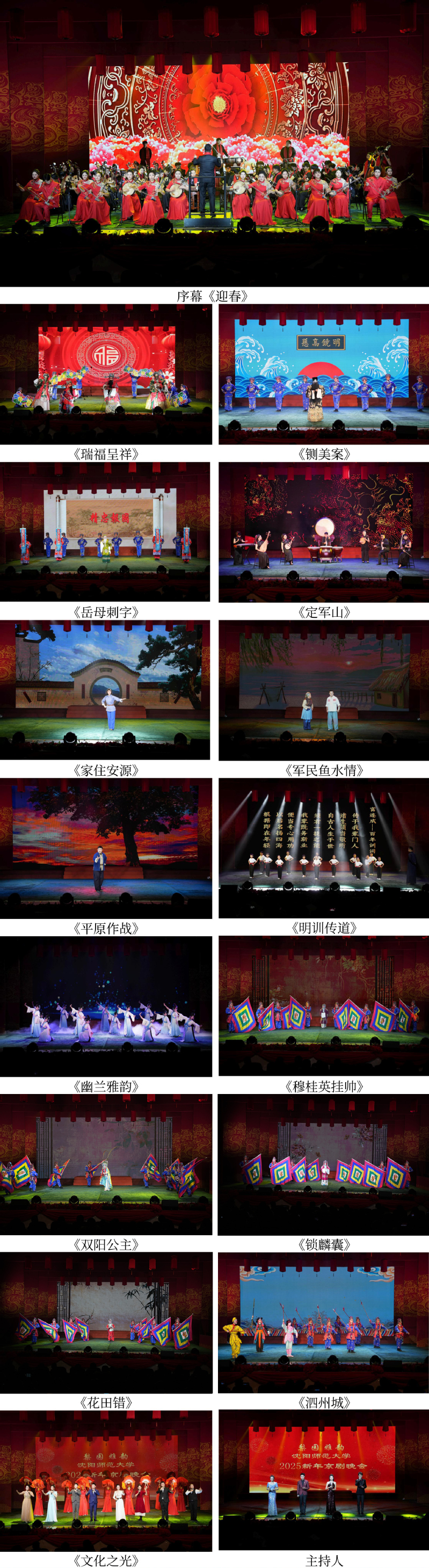 在“以文化人传弘道”篇章中,戏剧艺术学院赵向军教授携手辽宁省实验中学阳光小学雅音京剧队带来的《明训传道》,以诵读“百年训词”生动传递了京剧艺术中蕴含的做人、学艺、守德的深刻内涵,彰显了青年一代对京剧艺术的传承之志与崇敬之情;《幽兰雅韵》曾亮相十三省春节晚会并荣获全国大学生艺术展演二等奖,表演以戏曲身段中的水袖、折扇等元素为创作素材,将戏曲身段与当代审美完美结合;《穆桂英挂帅》《双阳公主》《锁麟囊》《花田错》“四大名旦经典唱段”重温经典,传统剧目《泗州城》气势恢宏,结尾曲现代京歌《文化之光》融合传统文化与现代艺术,表达了文艺工作者对中华文化的深厚情感与传承使命。