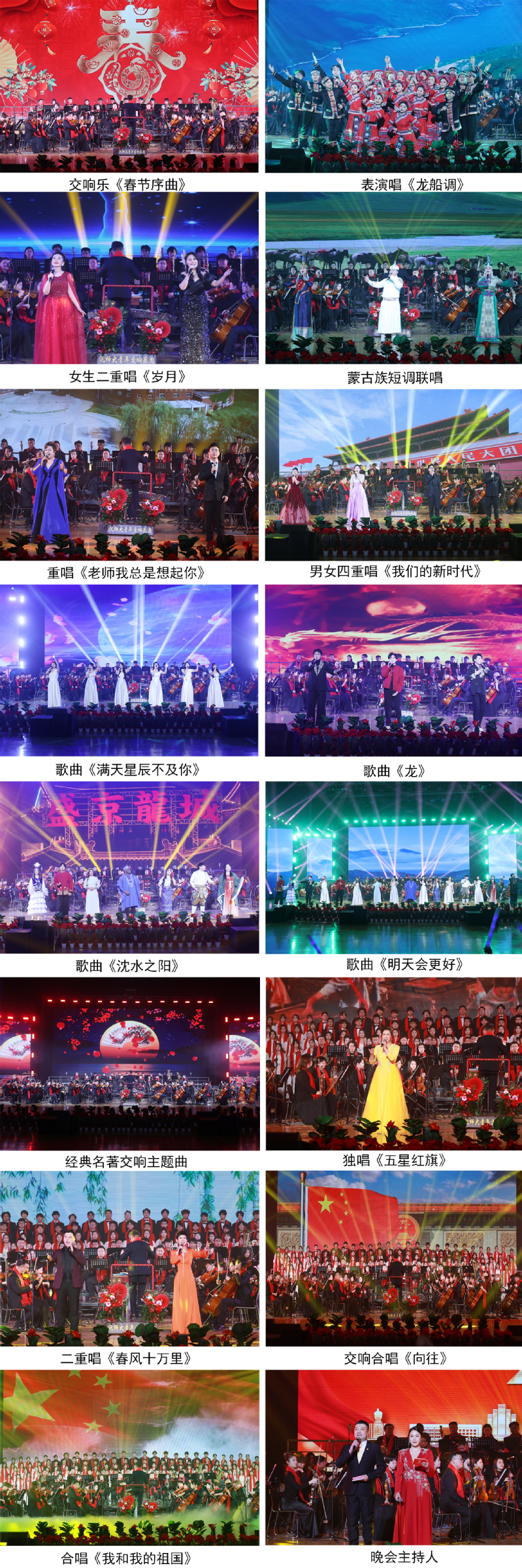 音乐会在学校青年交响乐团带来的《春节序曲》中拉开序幕,本次音乐会以“强教育之基 筑强国之梦”为主题,共分为“新春雅韵贺岁来”“师恩熠熠耀光辉”“赞歌嘹亮颂祖国”三个篇章。蒙古族短调联唱《达雅波尔》《诺恩吉雅》《关山颂》《草原情》独具特色、韵味悠长;重唱《老师我总是想起你》展现出人民教师躬耕教坛、传道授业的师者风范;来自泰国、尼日利亚、哈萨克斯坦、越南等国家的留学生带来的歌曲《沈水之阳》唱出了沈阳之美、沈阳之韵;由学校雷锋合唱团带来的交响合唱《向往》展现了全体沈师人齐心协力、砥砺奋进、担当作为的良好风貌。音乐会在全体师生齐唱《我和我的祖国》歌声中走向高潮。