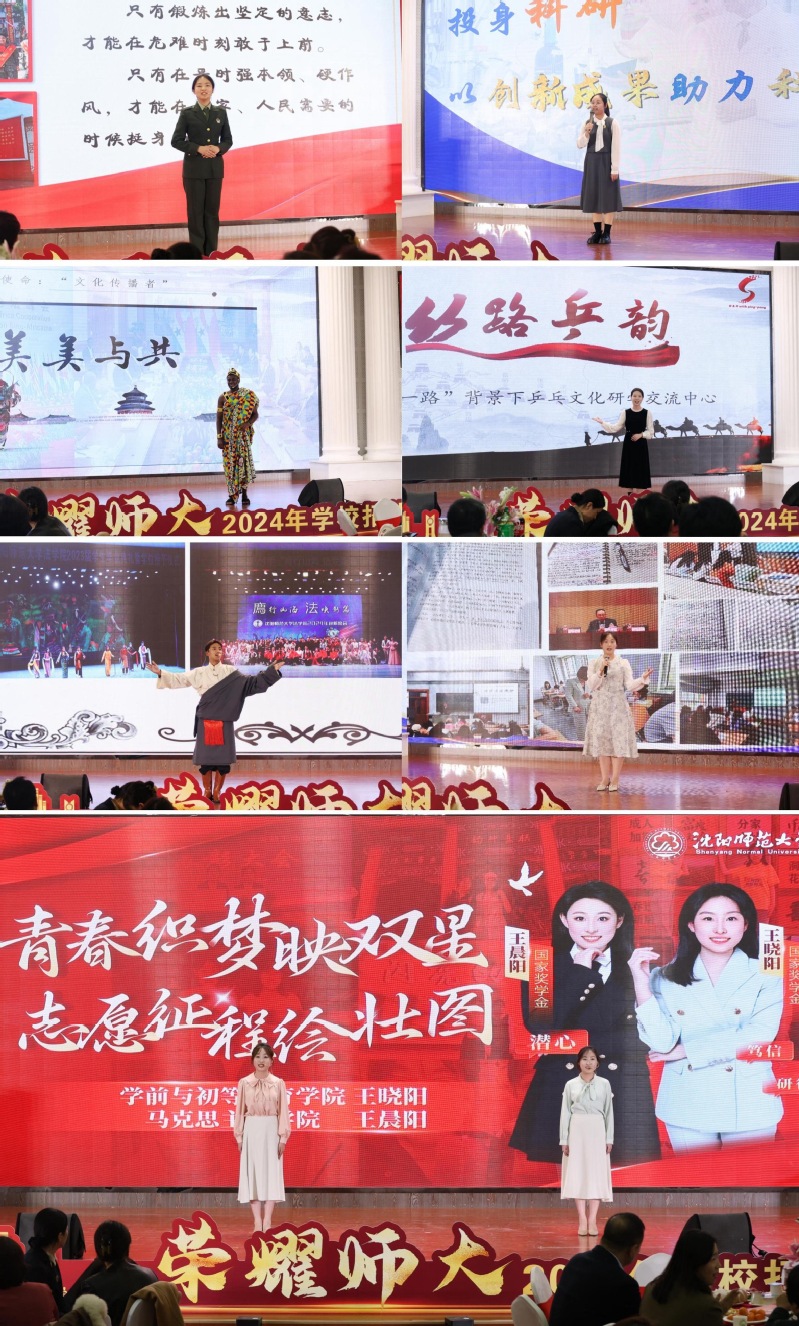 第二篇章彰显师大学子博学厚德、笃行致远、深耕专业、自信自强的师范底色。全国大学生文学作品大赛二等奖获得者吴思莹分享了她提升专业素质,练就过硬本领,立志成为新时代四有好老师的成长历程;2014届校友、沈阳市第七中学副校长王雨婷讲述了她投身教育事业,在岗位上迅速成长,用实际行动传承和弘扬沈师精神的故事。诗朗诵《传承》表达了师大学子传承和发扬教育家精神的决心和勇气。