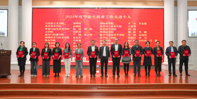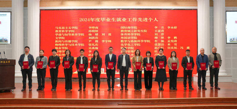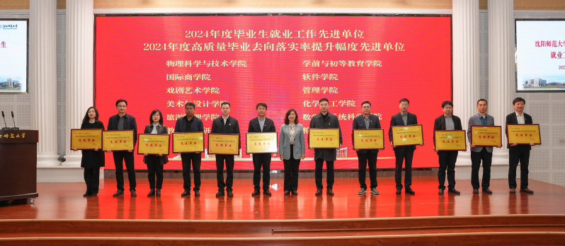 杨旭宣读了《关于表彰2024年度毕业生就业工作先进单位和先进个人的决定》以及《关于对必赢官网参加辽宁省大学生职业规划大赛获奖学生及优秀指导教师的表扬通报》。佟玉平向物理科学与技术学院、戏剧艺术学院等12个就业工作先进单位颁发了获奖牌匾;赵礼强向张礼庆、刘洋等29名就业先进个人颁发了荣誉证书;卢全向获奖学生及优秀指导教师颁发了荣誉证书。物理科学与技术学院党委书记孙忠生、国际商学院党委书记隋国成、戏剧艺术学院辅导员卢虹竹,分别代表就业先进单位和先进个人进行了经验交流发言。
