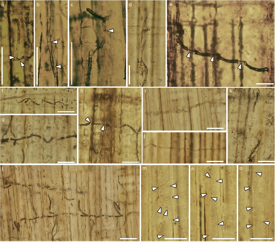 近年来,田宁研究团队一直致力于开展木化石内含真菌化石研究。研究团队在产自辽宁北票距今约1.6亿年的侏罗纪髫髻山组木化石中发现了大量保存精美的真菌菌丝化石。显微观察表明,这些深色菌丝具有明显的色素沉积特征,这与现代蓝变真菌具色素菌丝的特征十分相似。尤为重要的是,当穿越木材细胞壁时,菌丝会形成一种特殊结构——“穿透钉”。这一穿透钉结构的发现是确认化石真菌属于蓝变真菌的关键证据。因为,与通过酶解作用降解细胞壁的木材腐朽真菌不同,蓝变真菌缺乏分解木材结构的酶系统,因此该类真菌通过穿透钉这一机械方式突破木材细胞壁。