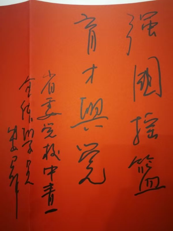 最后,西安美术学院党委副书记、院长朱尽晖代表调研组为学校留言“强国摇篮,育才兴党”。