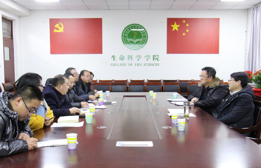 1月11日晚,党委书记张新柱在党委委员、党政办公室主任白振飞的陪同下深入生命科学学院进行调研,走访了解生科院实验室建设、科学研究开展情况,并与生科院领导班子成员举行了座谈,就生科院各项工作的发展现状和规划进行了交流。