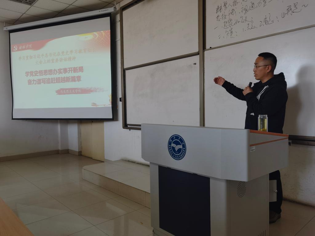 老师们以学党史悟思想办实事开新局,奋力谱写追赶超越新篇章为主题,围绕习近平在党史学习教育动员大会上的讲话精神、中共百年历史及榆林与中国革命和青年学子要学史力行三个方面,阐述了学习党史的重要性和紧迫性,要求同学们深入学习党的历史,尤其是地方党史文化知识,从中汲取智慧和力量,达到学史明理、学史增信、学史崇德、学史力行,坚定理想信念,继承和发扬党的成功经验和优良传统,励志笃学、惟实尚能,为实现中华民族伟大复兴贡献自己的力量。