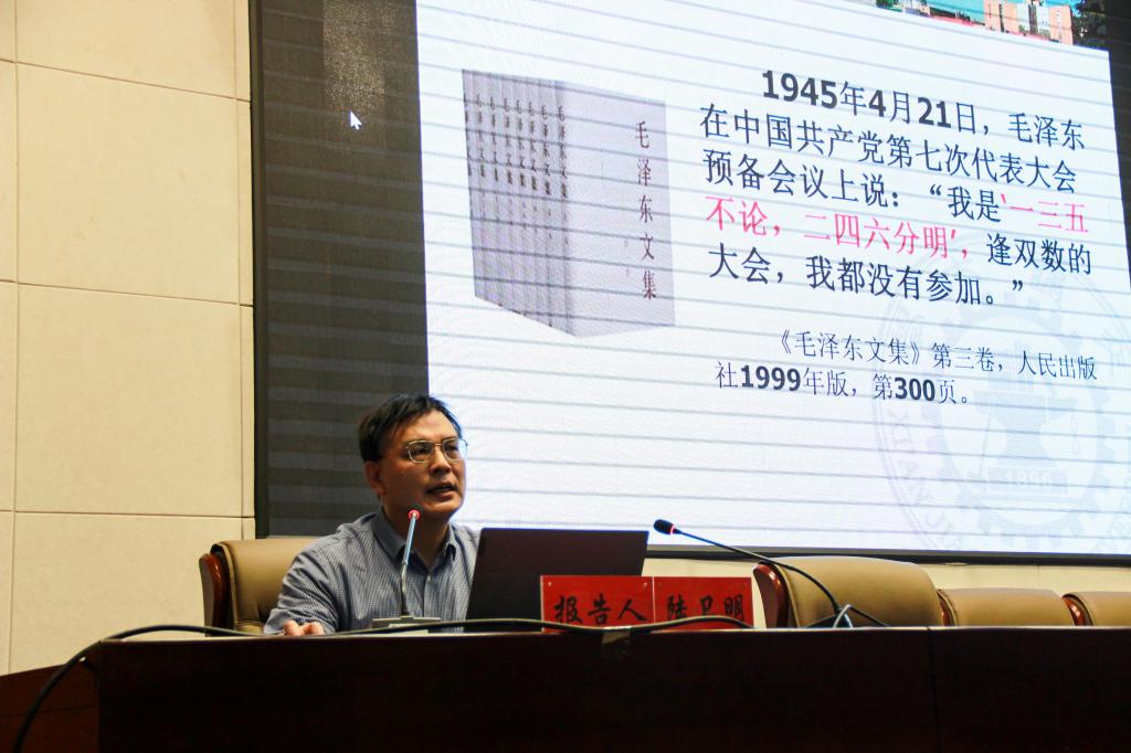 3月15日下午,中宣部干部培训专家、陕西省委理论讲师团特聘专家、西安交通大学陆卫明教授应邀来beat365作《毛泽东与中国革命》党史学习专题报告,副校长康伟主持报告会,党委相关部门全体干部和马克思主义学院、政法学院的部分师生聆听了报告。