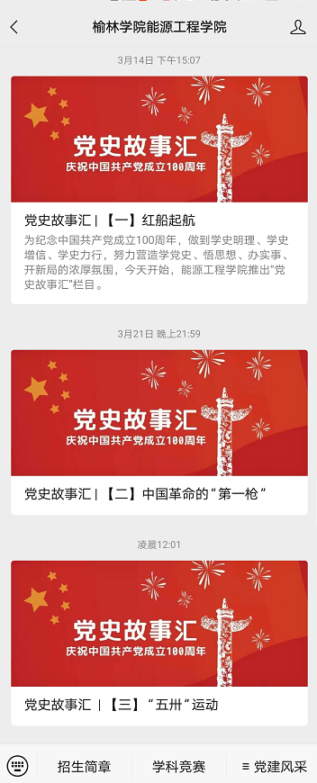 为了进一步讲好党史故事,传承红色基因,能源工程学院学生党支部通过官微特别开设《党史故事汇》专栏,以历史时间为主轴,精心挑选党的历史上的重大事件、重要会议、重要人物的经典故事,每周推送一期党史小故事,同时面向全院选拔优秀学生主播对推送的党史故事进行主题播音。坚持从学生中来、到学生中去,引导全院学生学习传承中国共产党在长期奋斗中铸就的伟大精神和积累的宝贵经验,更加自觉地从党的历史中汲取开拓前进的智慧和力量。《党史故事汇》栏目目前已推出第3期,阅读、点赞、转发超1000人次。