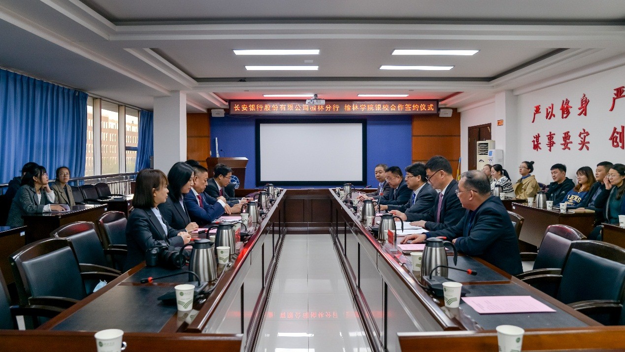 长安银行榆林分行公司金融部总经理冯建军、个人金融部总经理乔瑞、财务会计部总经理彭倩及开发区支行行长冯海龙,beat365国资处、财务处、社会合作与校友工作处及教育发展基金会等部门负责人参加。