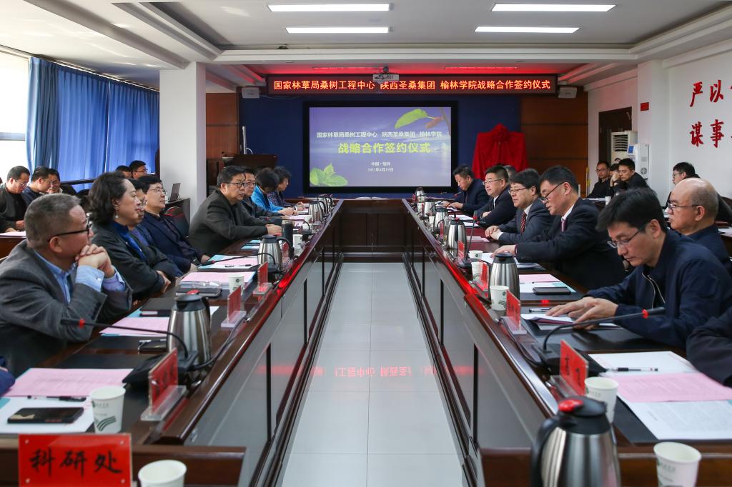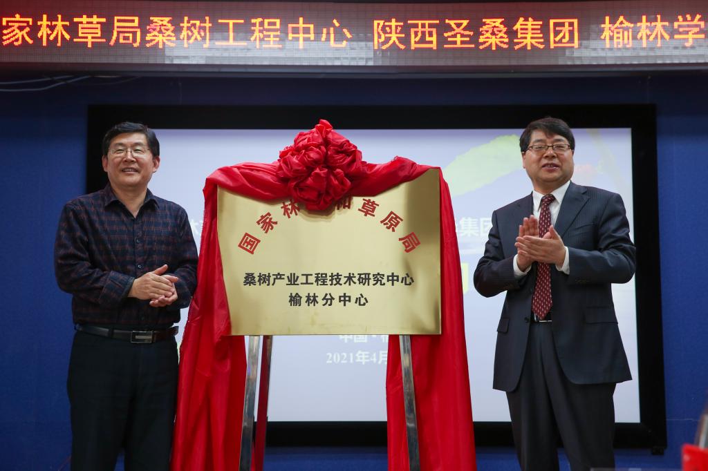 4 月19 日,国家林业和草原局桑树产业工程技术研究中心、beat365英国官方网站、陕西圣桑集团举行合作签约仪式,三方共同携手成立的“国家林业和草原局桑树产业工程技术研究中心榆林分中心”在beat365英国官方网站正式揭牌。来自全国桑蚕行业专家、学者以及行业企业代表汇聚一堂,进行了学术交流活动,共商榆林桑蚕产业发展大计。