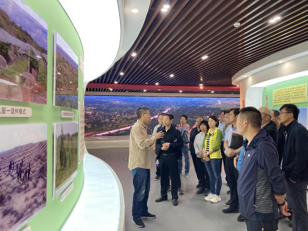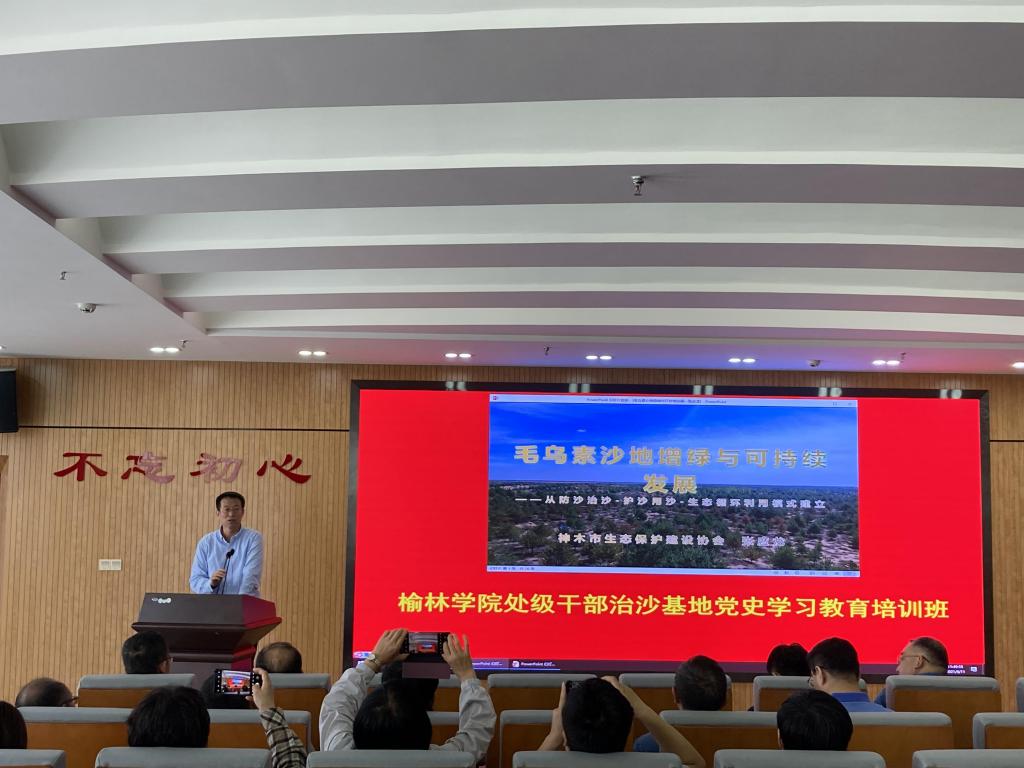参观后,在基地会议室,张应龙作题为《毛乌素沙地增绿与可持续发展》的报告,与大家分享了陕北人爱国爱家情怀和艰苦奋斗精神在推动毛乌素沙漠治理中的突出作用。