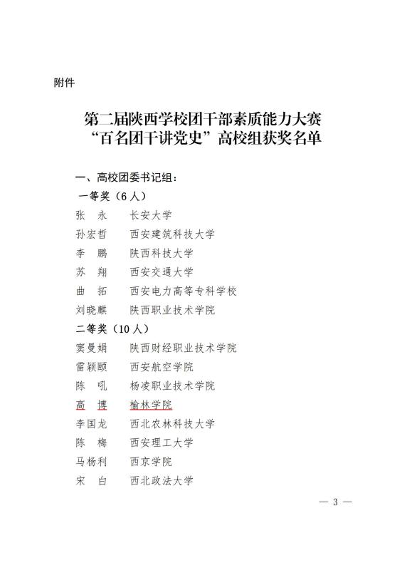 6月24日,由团省委、省委党史研究室、省委教育工委举办的第二届陕西学校团干部素质能力大赛“百名团干讲党史”比赛落下帷幕。经过激烈角逐,校团委副书记高博获“高校团委书记组”二等奖;建筑工程学院团总支书记叶韬、化学与化工学院团总支书记徐绘获“专职团干部组”二等奖;政法学院学生团干任鹏宇获“学生团干部组”二等奖。