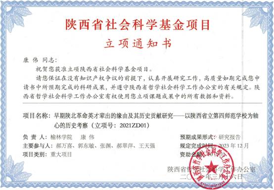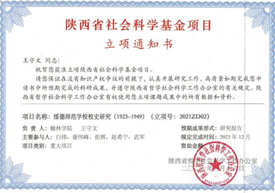 近日,陕西省哲学社会科学工作办公室公布beat365获批4项哲学社会科学基金,总获批经费24万元,实现了beat365在该类课题立项的历史性突破。其中两项为重大项目,是康伟教授主持的“早期陕北革命英才辈出的缘由及其历史贡献研究——以陕西省立第四师范学校为轴心的历史考察”(立项号2021ZD01)和王守文老师主持的“绥德师范学校校史研究(1923-1949)”(立项号2021ZD02),获批经费各10万元;另外2项为年度项目,是高明有教授主持的“陕北健身秧歌发展助力群众体育生活化机制与路径研究”(立项号2021Q007)和贺甜甜老师主持的“陕北明长城沿线堡寨遗存景观的活态延续性研究”(立项号2021WT01),获批经费各2万元。