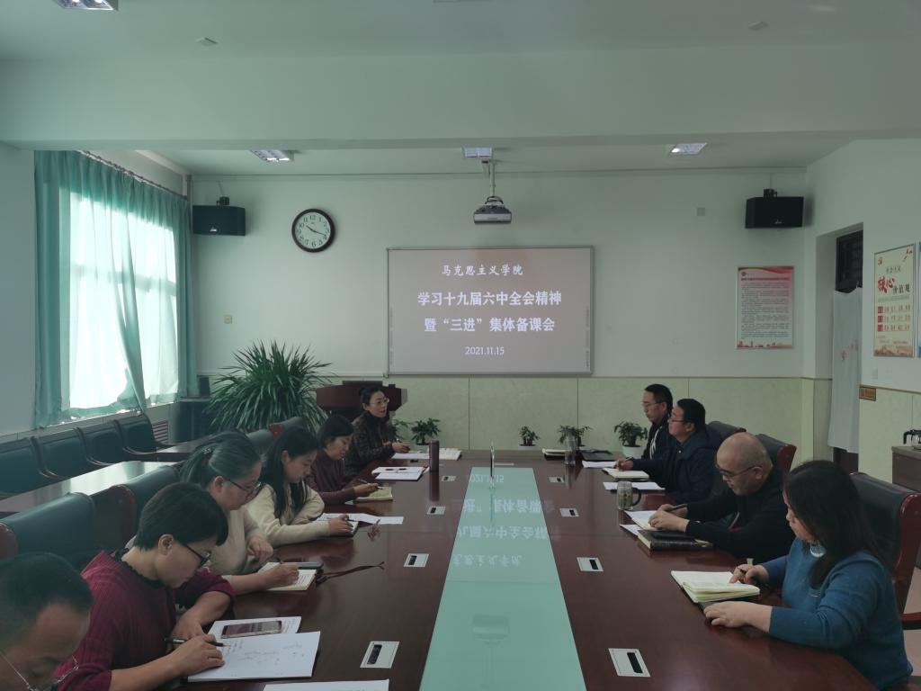 11月15日,马克思主义学院召开十九届六中全会精神学习研讨会暨六中全会精神“三进”即“进教材教案、进课堂、进师生头脑”集体备课会,学院支部书记、教研室主任、科级以上干部参加会议。