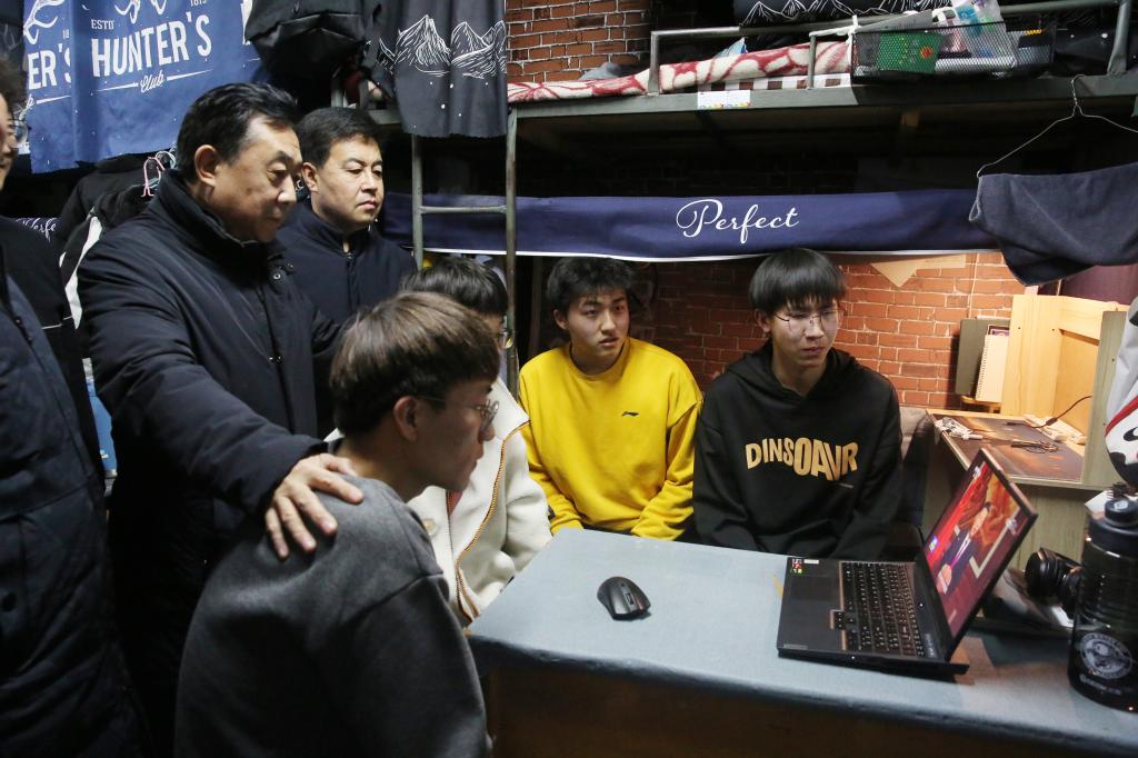傍晚,校园里灯光温润,老师们纷纷走进宿舍,给学习了一天的学子送去新年的祝福。党委副书记尚爱军携党政办公室、宣传部、学生处、校团委、财务处等部门负责人走进学生公寓跟孩子们一起收看、收听国家主席习近平发表的2022年新年贺词。