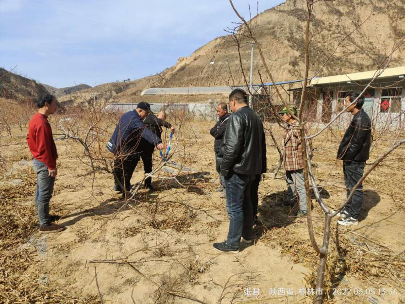 专家组在清涧县石咀驿镇枣林则沟村为村民进行春季桃树与杏树修剪现场培训,到刘家川村调研苹果产业。