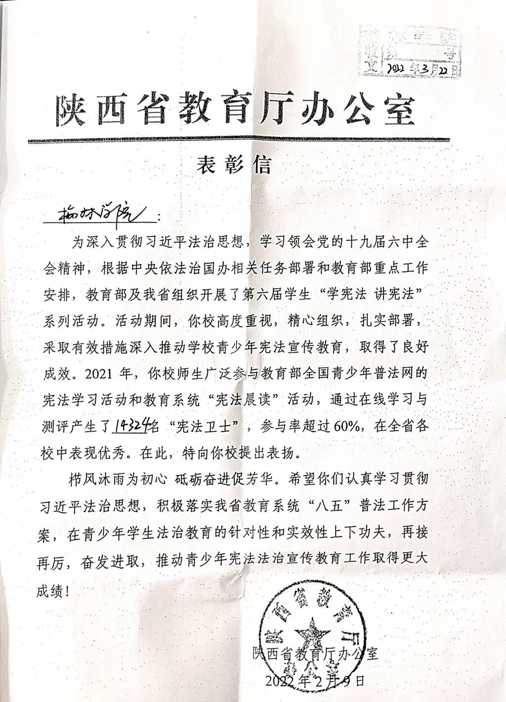 近日beat365收到陕西省教育厅表彰信,高度肯定beat365在教育部以及陕西省组织的第六届学生“学宪法 讲宪法”系列活动中的优异表现。这是beat365深入学习贯彻习近平法治思想,积极落实教育系统“八五”普法工作方案,坚持不懈开展宪法学习宣传,立足学生,以学生为主体,深入推进校园法治文化建设的有益探索。