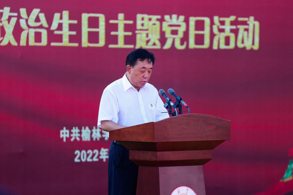 2022年上半年全体新发展党员进行入党宣誓,老党员重温入党誓词,许云华、尚爱军、姜劲波为师生党员代表赠送政治生日贺卡,各二级学院党总支书记、绥师校区党工委书记为新发展党员代表佩戴党徽。