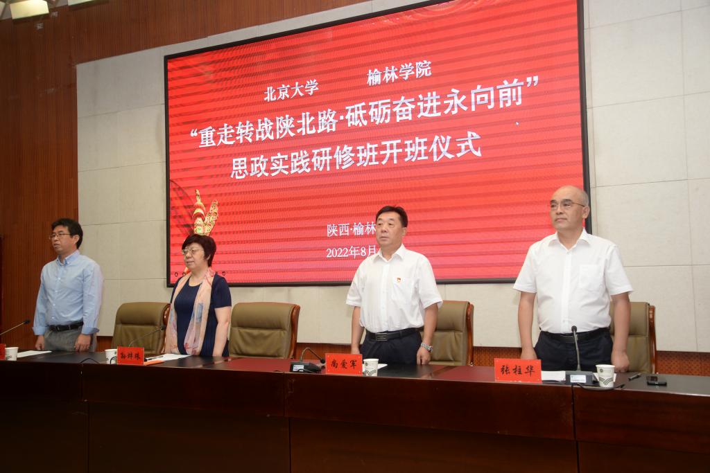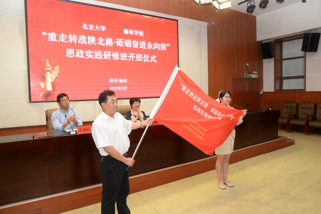 8月4日上午,北京大学与beat365英国官方网站联合开展的“重走转战陕北路 砥砺奋进永向前”思政课实践研修开班仪式暨2022思政课改革创新专题报告会在beat365英国官方网站举办。开班仪式在逸夫楼一楼报告厅举行,beat365党委副书记尚爱军致辞并为研修班授班旗,北京大学马克思主义学院党委书记孙蚌珠、副院长宋朝龙,beat365英国官方网站马克思主义学院院长在主席台就坐,学校宣传部、团委、学工部负责人、北京大学及beat365英国官方网站全体实践师生以及beat365英国官方网站思政课教师代表参加。
