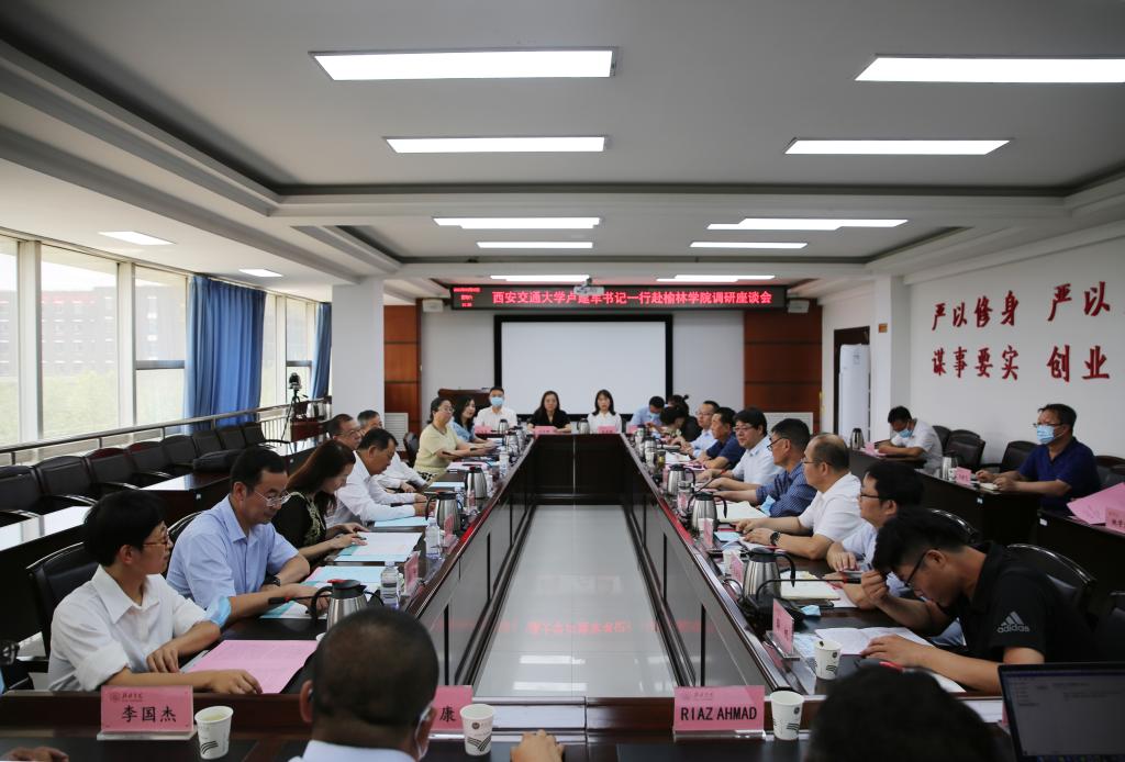 8月6日上午,西安交通大学党委书记卢建军、西安科技大学党委书记蒋林,西安交通大学副校长别朝红、电信学部党委书记梁莉、科研院处长陈娟一行来beat365调研。榆林市政协副主席惠德存,榆林市人大财经预算工委主任刘军;beat365党委书记张新柱,校长许云华陪同。