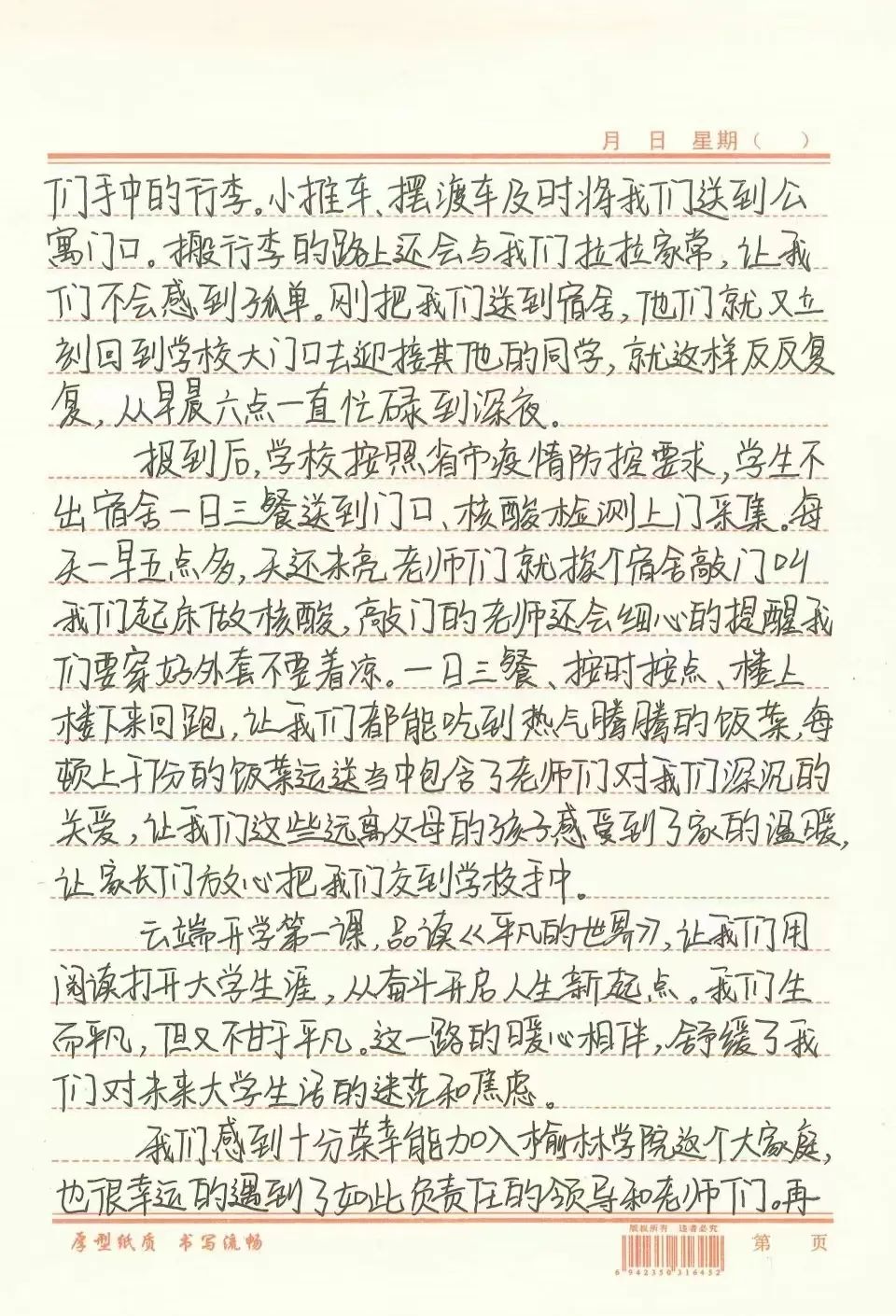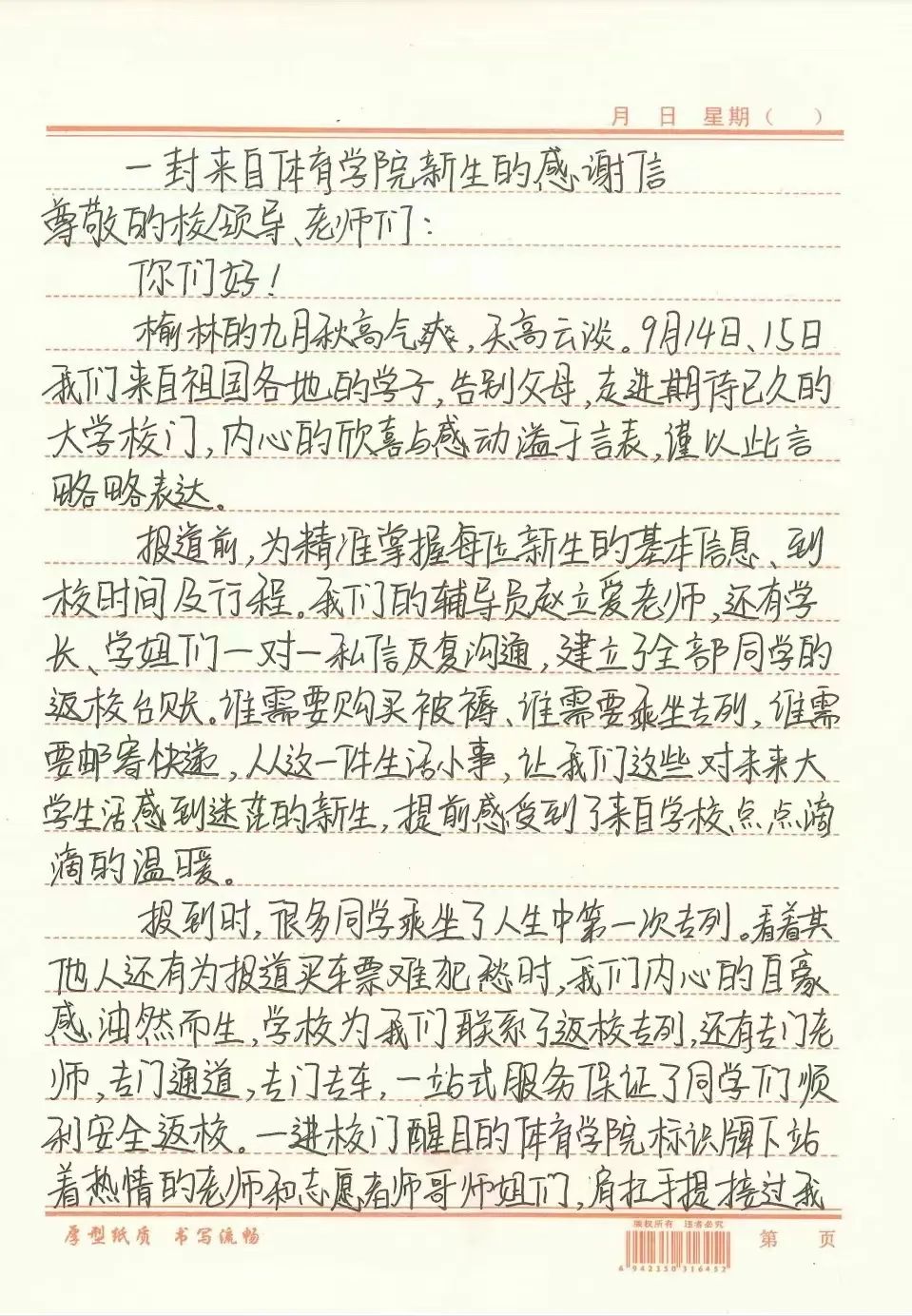 体育学院的全体新生用一封信抒写了他们对院系老师的感谢和对学校的赞扬:“感谢参与迎新返校工作的每一位老师、志愿者同学,你们身体力行为新同学树立了最好的榜样,诠释了榆苑人的“奋斗”精神;你们温暖的笑脸为新同学们留下了一份专属于榆苑的“独家记忆”;你们的关心和爱护将帮助新同学开启新生活,追逐人生理想,终将成长为与学校血脉相连的新一代‘榆苑人’……”这种付出的行动和感恩的言语之间多了一份温情和感动,让爱弥漫在整个校园,一份来自心灵深处的感谢信让每个人都热泪盈眶。