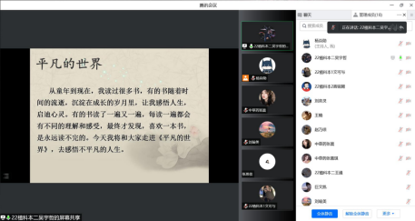 在周末,生命科学学院辅导员杨焱勋主持了这样一场线上读书分享会。一端是各班对《平凡的世界》有着自己理解的学生,一端是部分对路遥先生有着崇敬之情的学生。不同想法,不同班级的学生,在云端相遇,进行着思想的交流与碰撞。