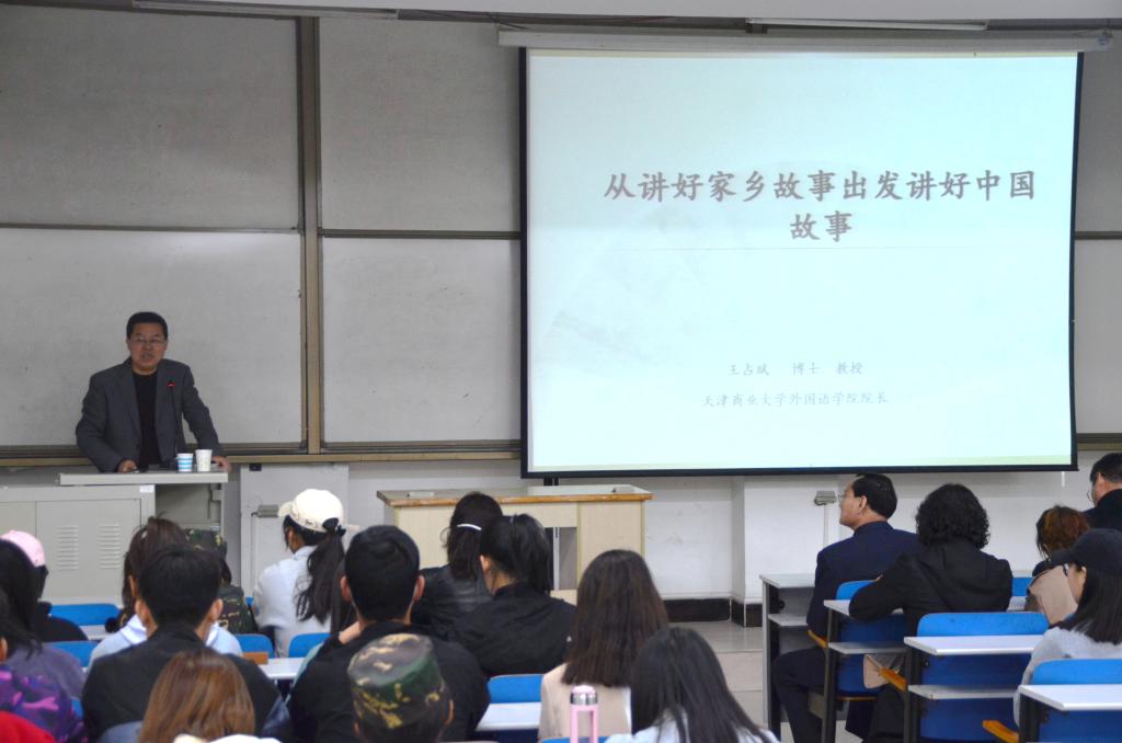 王占斌教授为外国语学院师生作了《从讲好家乡故事出发 讲好中国故事》专题报告。他指出,“讲好”中国故事就是要处理好作品、译者和接受者的关系,杜绝“译而不化”和“归而大化”的极端行为。他以陕北民歌翻译为例,从民歌比兴修辞手法、陕北民歌的叙事伦理、陕北民歌翻译体制和对译者的要求等方面进行了阐释。讲座深入浅出、通俗易懂,使在座师生对陕北民歌的翻译有了更深刻的认识和理解,进一步领略到了陕北民歌的内涵和美妙。他还就如何在当前的时代背景下自信地“讲好家乡故事”“讲好中国故事”提出了独特见解。王教授还介绍了天津商业大学外国语学院研究生的招生情况,鼓励同学们踊跃报考。